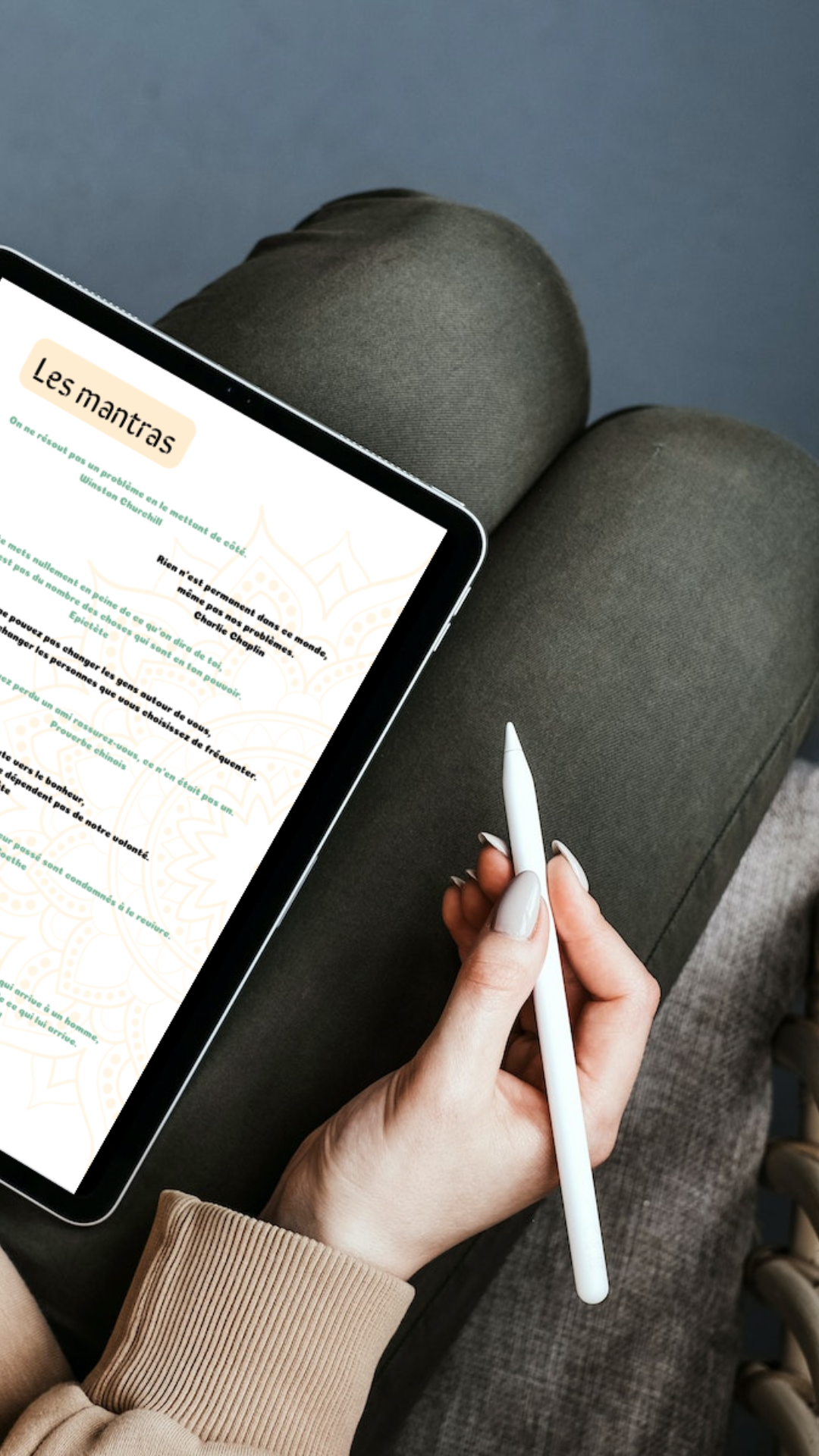 Tu accèdes à un espace membre dans lequel tu trouveras 6 audios, un carnet PDF, et les bonus : une séance de relaxation audio, l'épisode de podcast et son exercice PDF, les mantras sont inclus dans le carnet d'introspection.